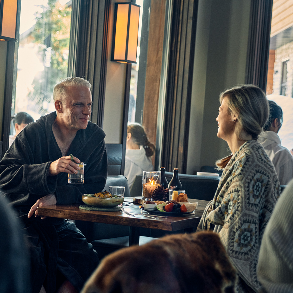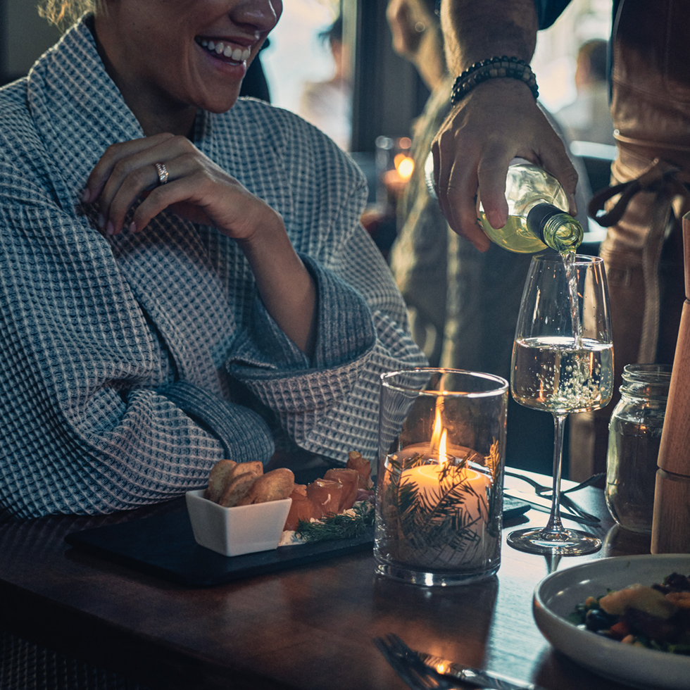 Highlight: A mouthwatering dining experience by the fire, wrapped in the comfort of a plush robe.