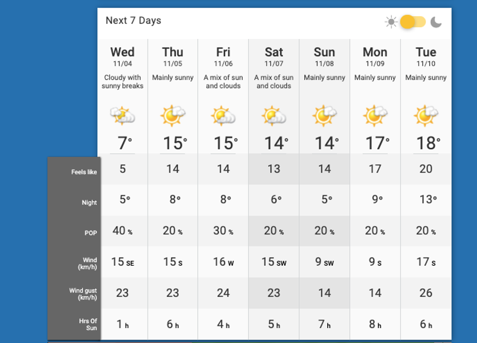 From Thursday, November 5 to the following Tuesday, temperatures in Montreal are set to be between 14 to 18 C every day.