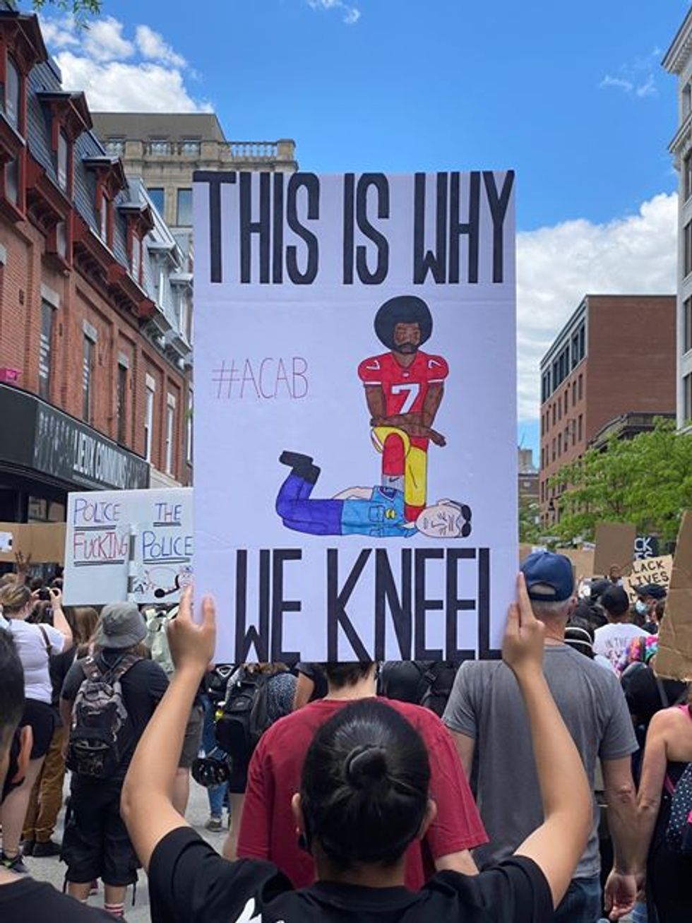 The poster below combines imagery from the murder of George Floyd by police officer Derek Chauvin and NFL quarterback Colin Kaepernick kneeling while the national anthem was sung at a preseason game in 2016.