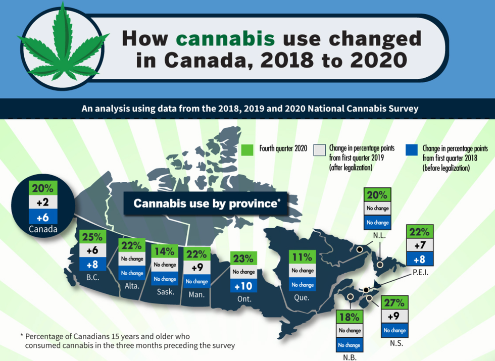 A new Statistics Canada graphic shows how cannabis use in Canada changed from 2018 to 2020 — and, apparently, Quebec is the least stoned province in the country.