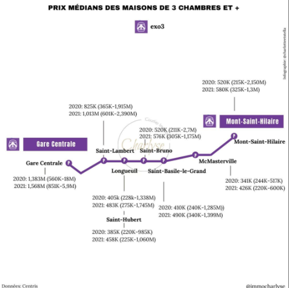 Via Capitale du Mont-Royal real estate agent Charlyse Amoussou created the maps and compared "the prices for 2020 and the first quarter of 2021 so you can see the evolution and know the current median prices." Every train stop on the maps "represents a municipality or area."