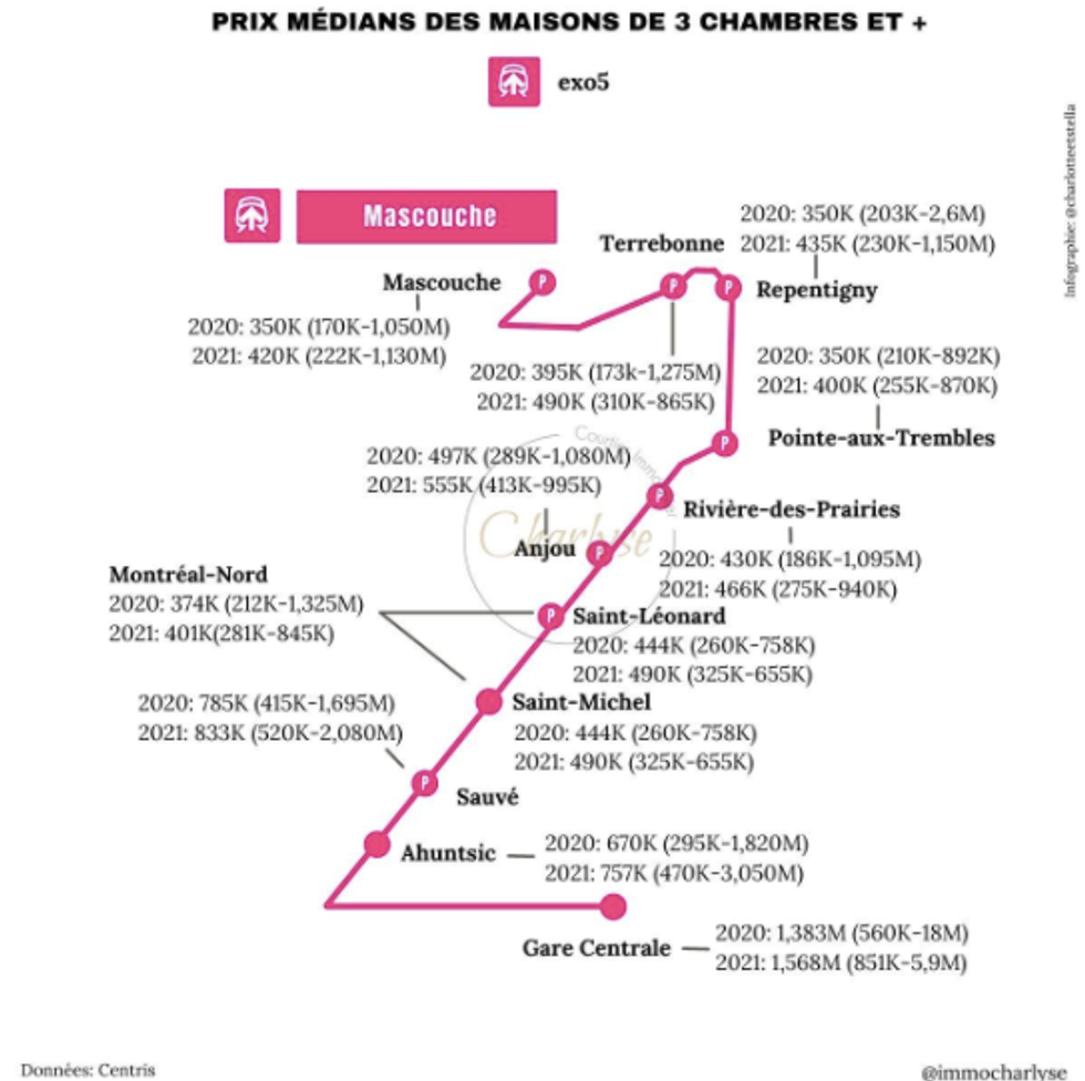 For areas around the exo1 line, the cheapest to live in currently is Île Perrot with the median 3+ bedroom home price being $468,000.