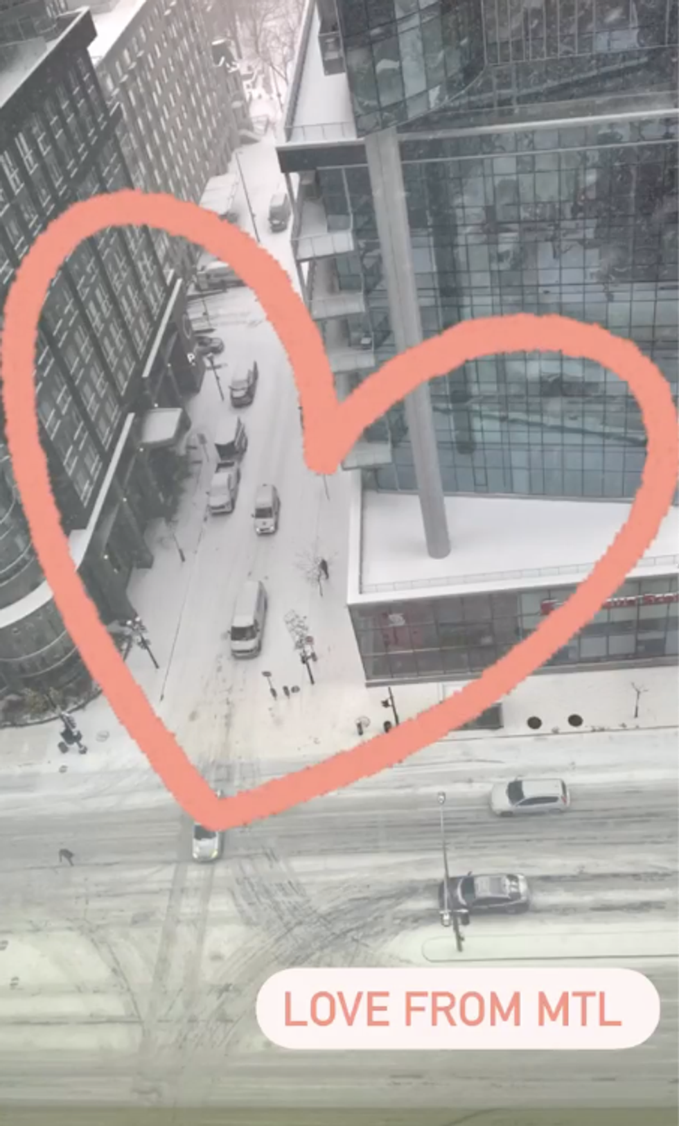 The photo seems to be taken from her apartment/hotel and shows the intersection of René-Lévesque and de la Montagne filled with snow. She posted a similar photo back in October.