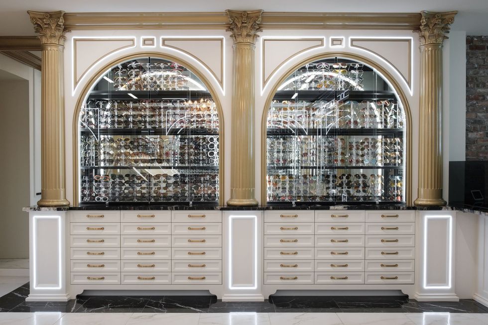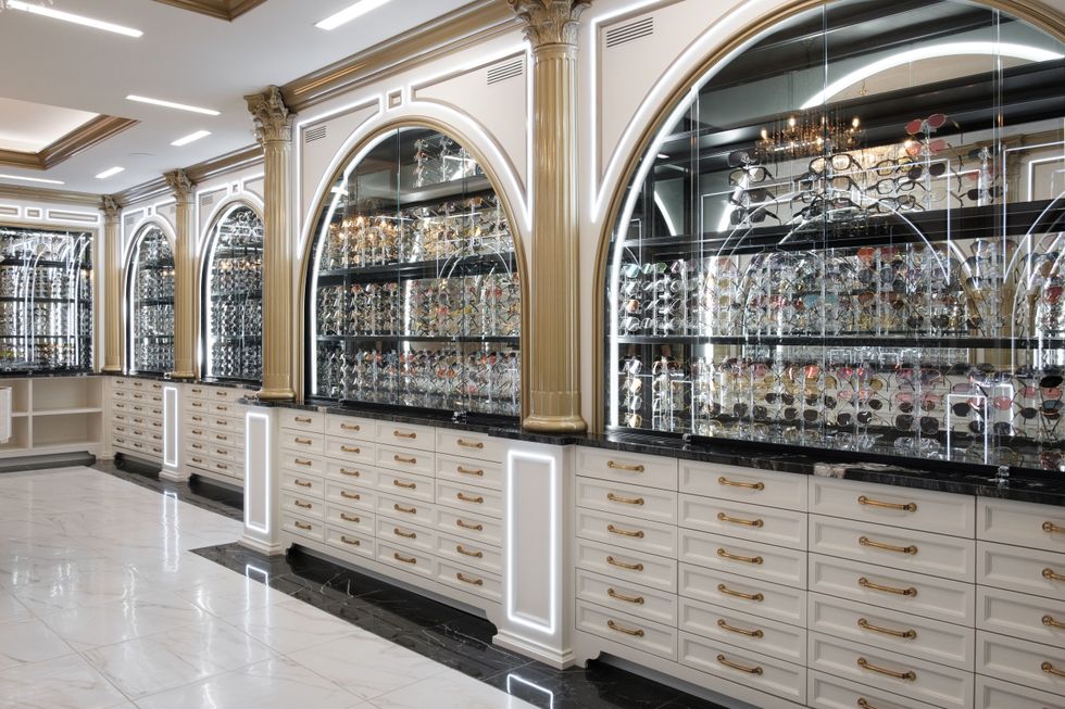 Elton John's residency in Vegas was the inspiration for this St-Henri store, "mixing Greek and Roman design cues such as columns and marble with modern touchpoints of LED lighting and AR visuals to create more than just a trip to an optical store, but an experience."