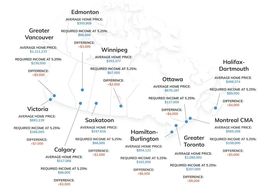 According to the map, you now need a salary of $108,000 to afford a mortgage in the Montreal Metropolitan Area where the average home price is $565,208 — an increase of $5,000 compared to prior stress test rules.