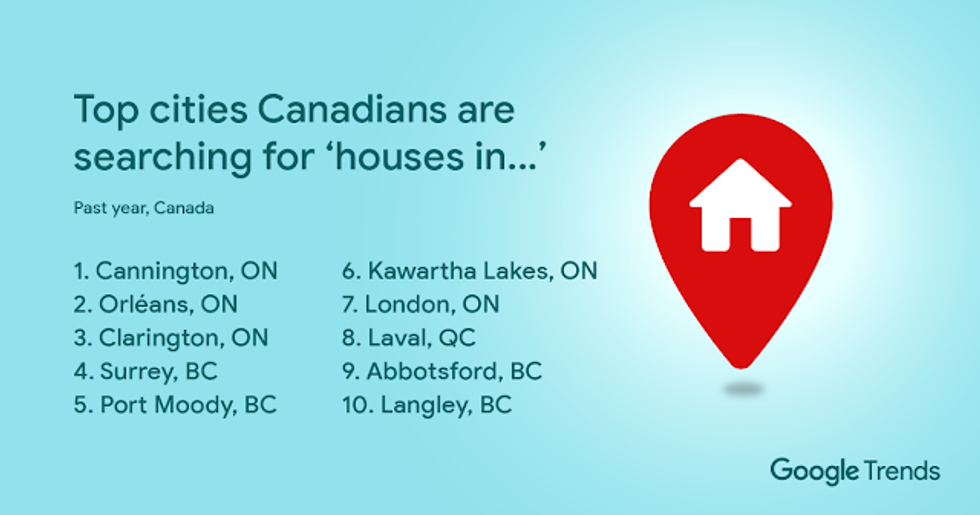 The majority of the top cities Canadians are searching for 'houses in...' are in Ontario and B.C., with the most searched for being Cannington, Ontario.