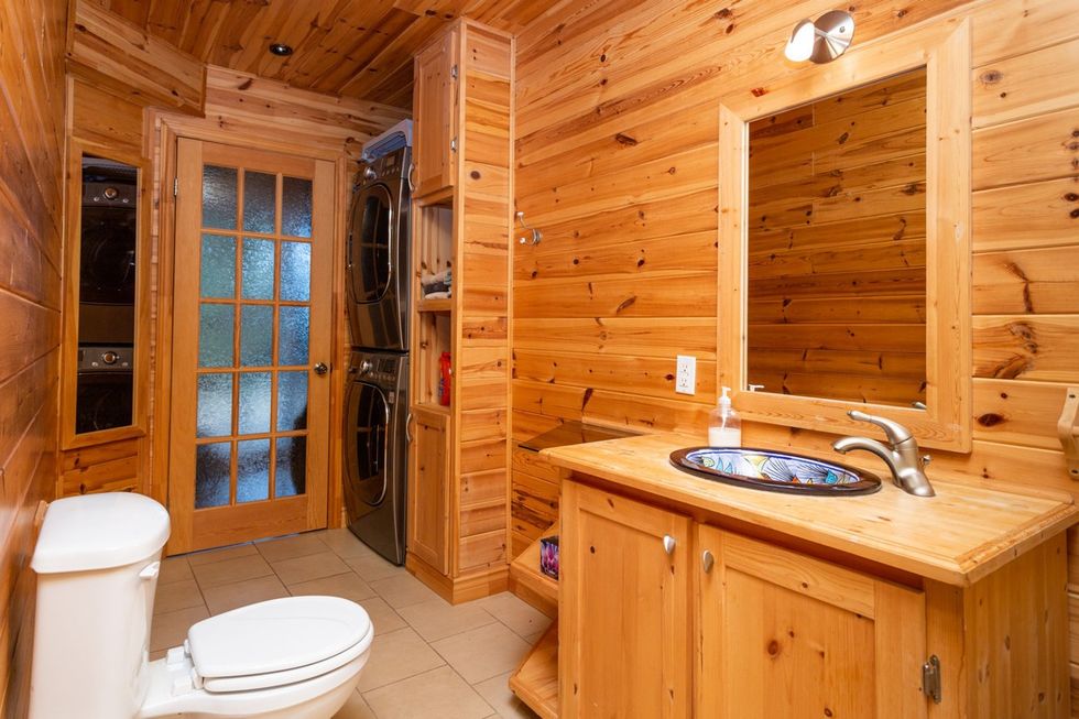 This large home has some serious rustic vibes, between the red window frames and the wood exterior.