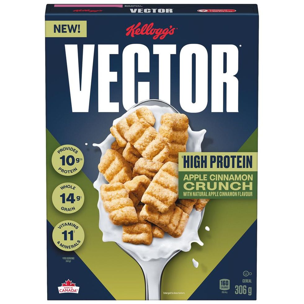 The latest Vector variation combines apple and cinnamon flavours with 10 g of protein, 14 g of whole grains and 11 vitamins and minerals.