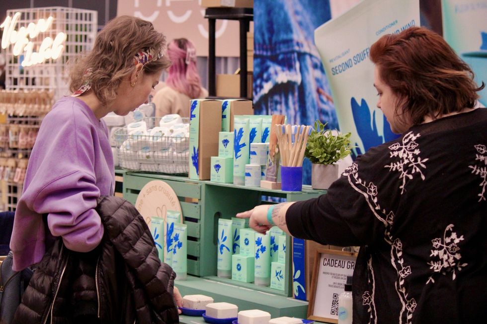 Two people wearing pink aprons at a booth for Gusta. Right: Someone behind a display of Chia's Organic at Montreal's Vegan Festival.