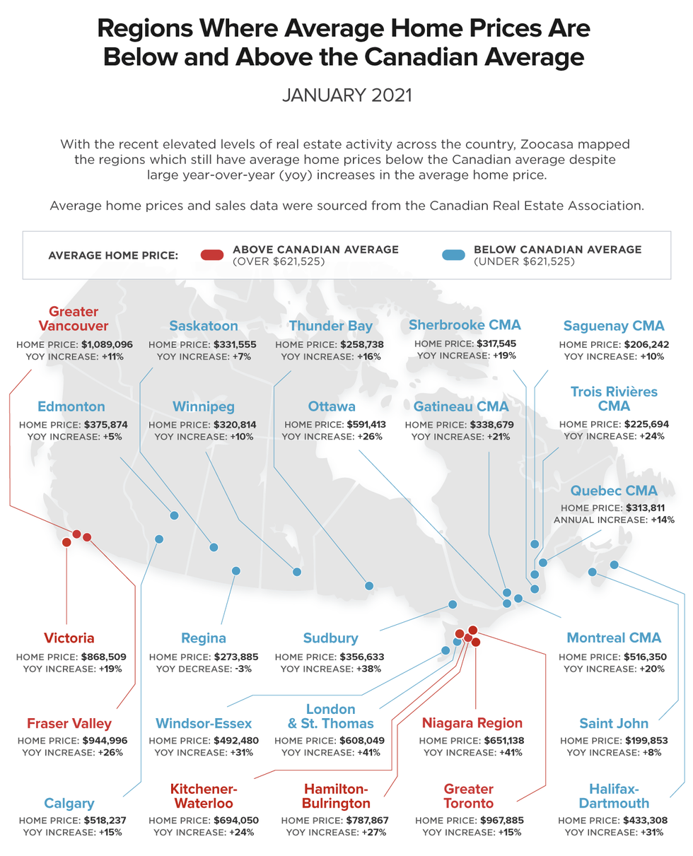 In a report published February 18, Zoocasa, a real estate agency, crunched sales numbers from the Canadian Real Estate Association and found the average price for a Canadian home reached $621,525 in January – 23% more than a year before.