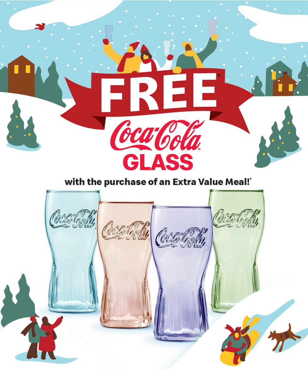 As a little gift this holiday season, McDonald's is handing out free collectible Coca-Cola glasses with the purchase of an extra value meal.
