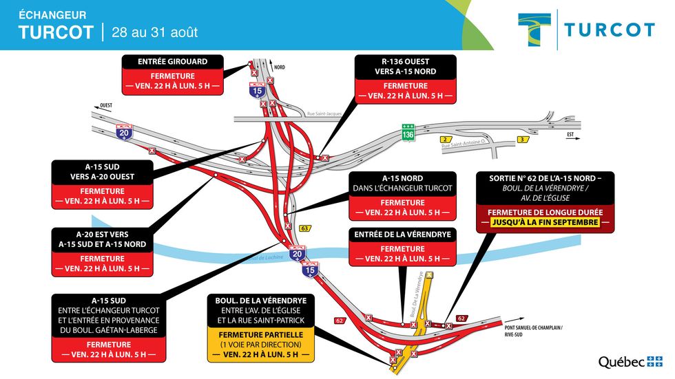 Exit 62 (De La Vérendrye/De l'Eglise), which will be closed until the end of September;