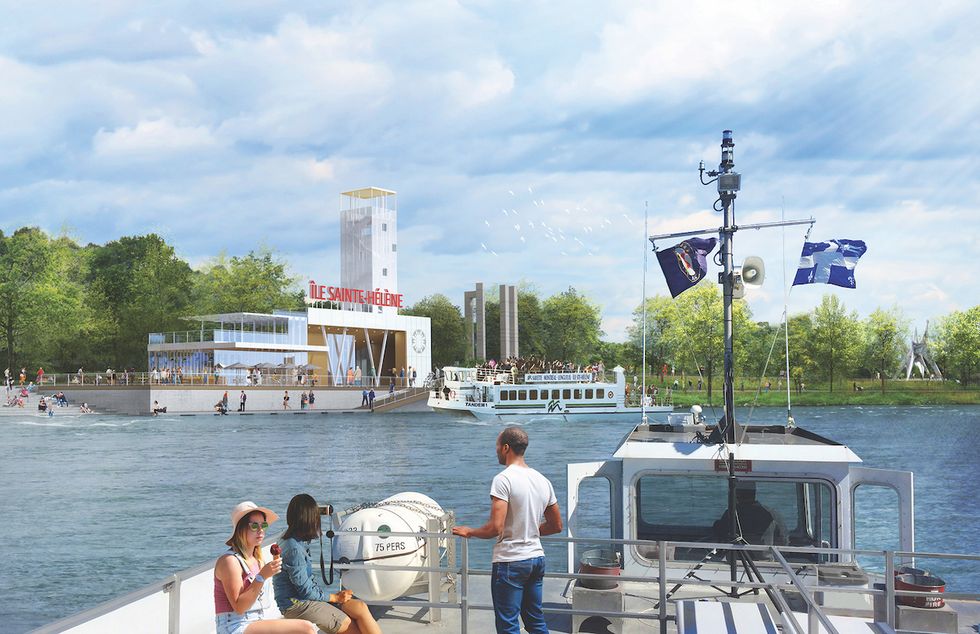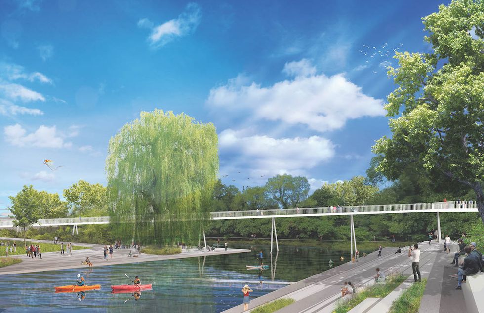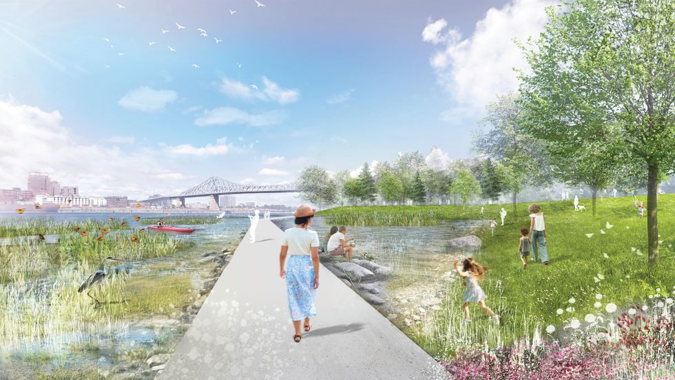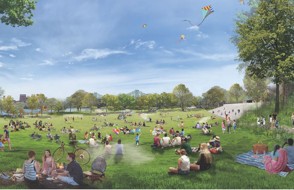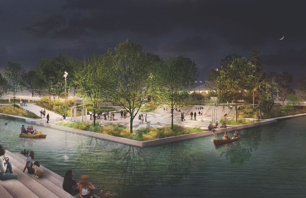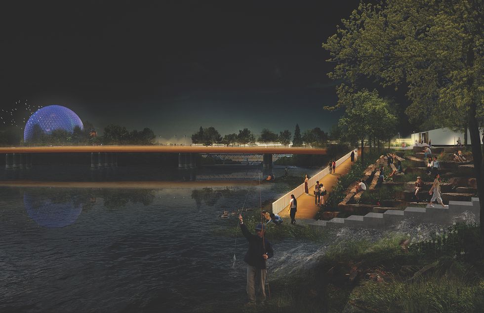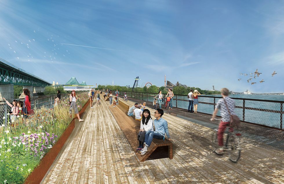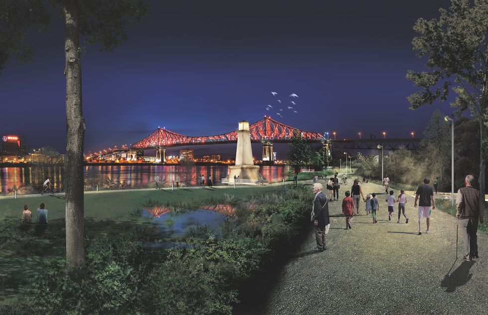 A rendering showing people walking along waterfront paths with the Jacques-Cartier Bridge lit up in the distance calls Jean-Drapeau the "Brooklyn Bridge Park" of Montreal.