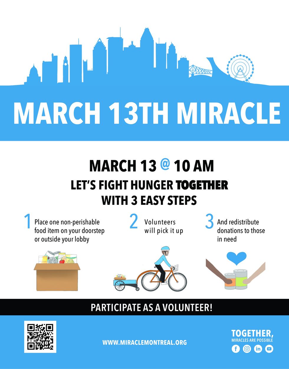 A food drive in Montreal that saw incredible success last year is back this March and the organizers are counting on Montrealers' kindness once again! The March 13th Miracle is looking for both volunteers and donors in the Greater Montreal area for the upcoming food drive initiative.