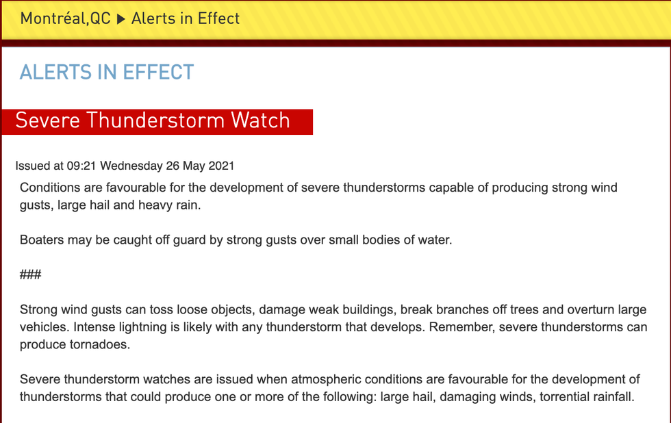 According to The Weather Network, there's currently a "severe thunderstorm watch" in effect for the Montreal area.
