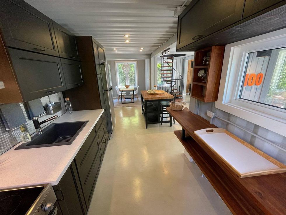 Description: A modern and unique two-bedroom house made from five Corten steel shipping containers.
