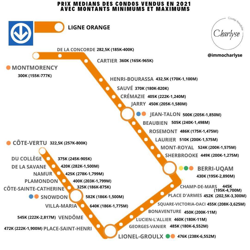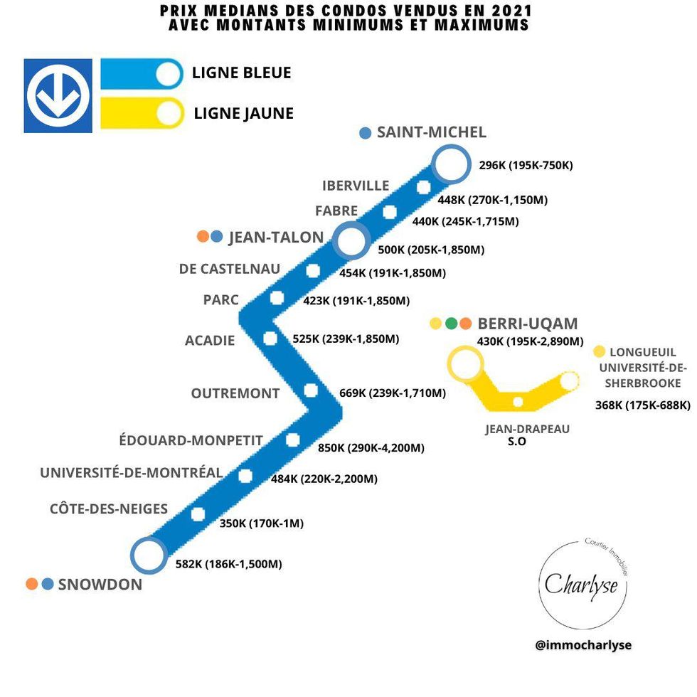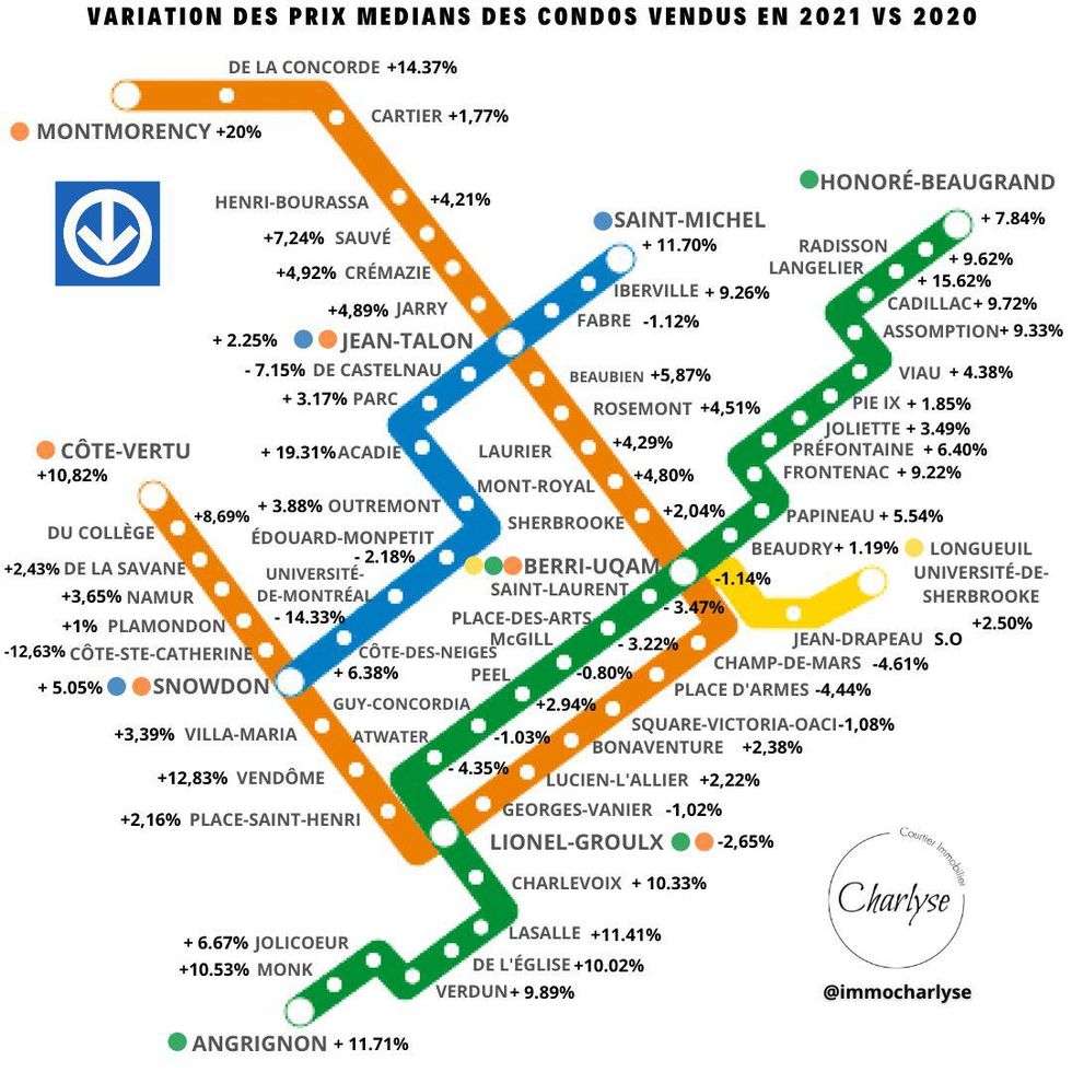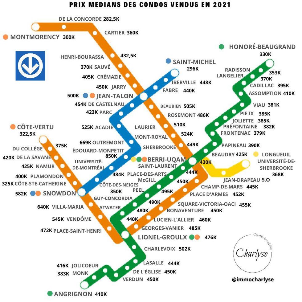 Prochaine station: a huge mortgage payment. A series of Montreal metro maps by Via Capitale real estate broker Charlyse Amoussou shows median condo prices around every station in 2021.