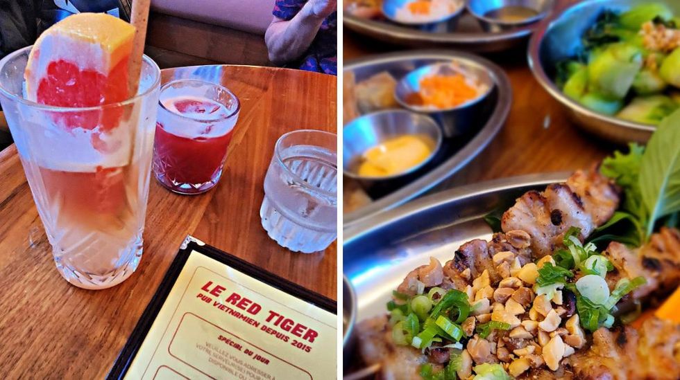 Diners at Le Red Tiger eat under the red glow of a neon sign. Right, Two drinks next to the menu, one with a slice of grapefruit and the other with a red hue.