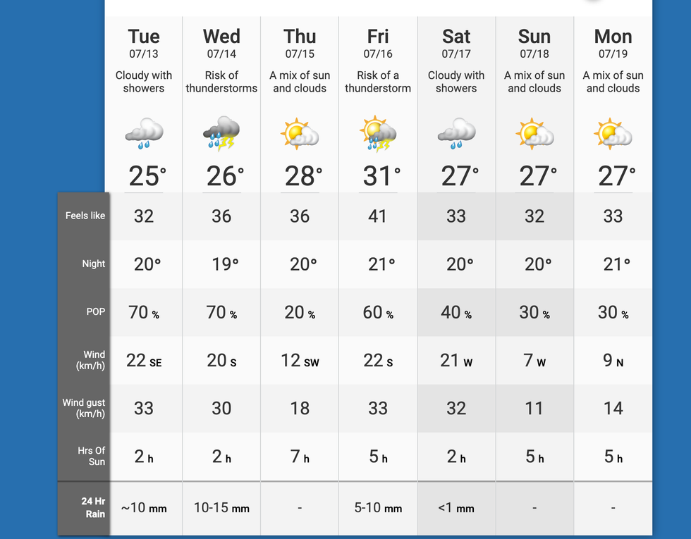 But at least it'll be hot — every day this week is expected to feel like 32 C or more.