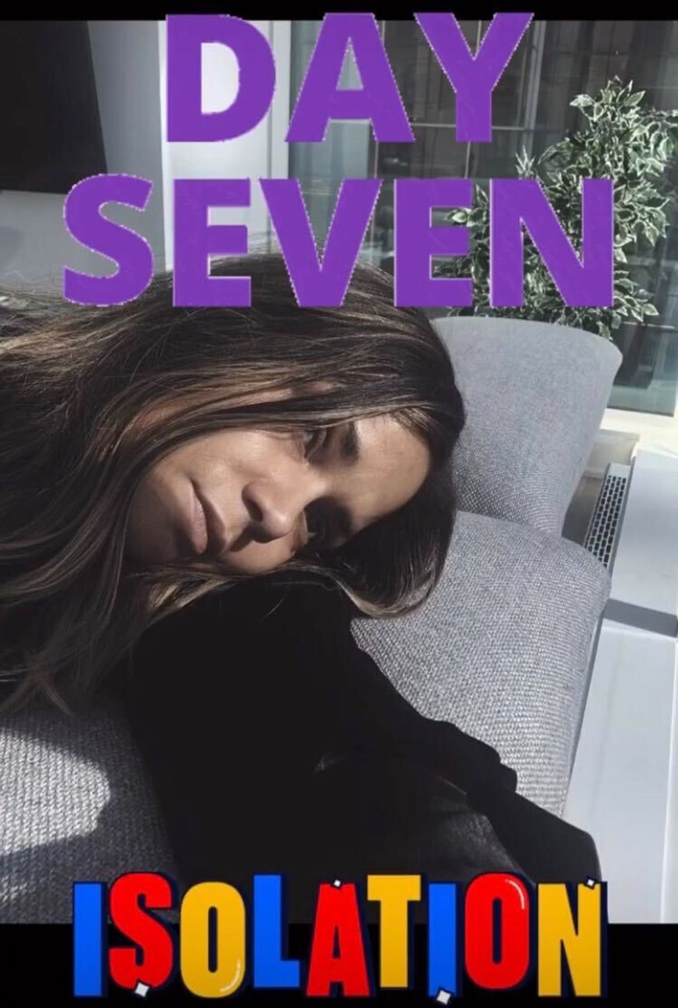 On day seven of quarantine, she posted a photo of herself looking unenthused while lying down on a couch.