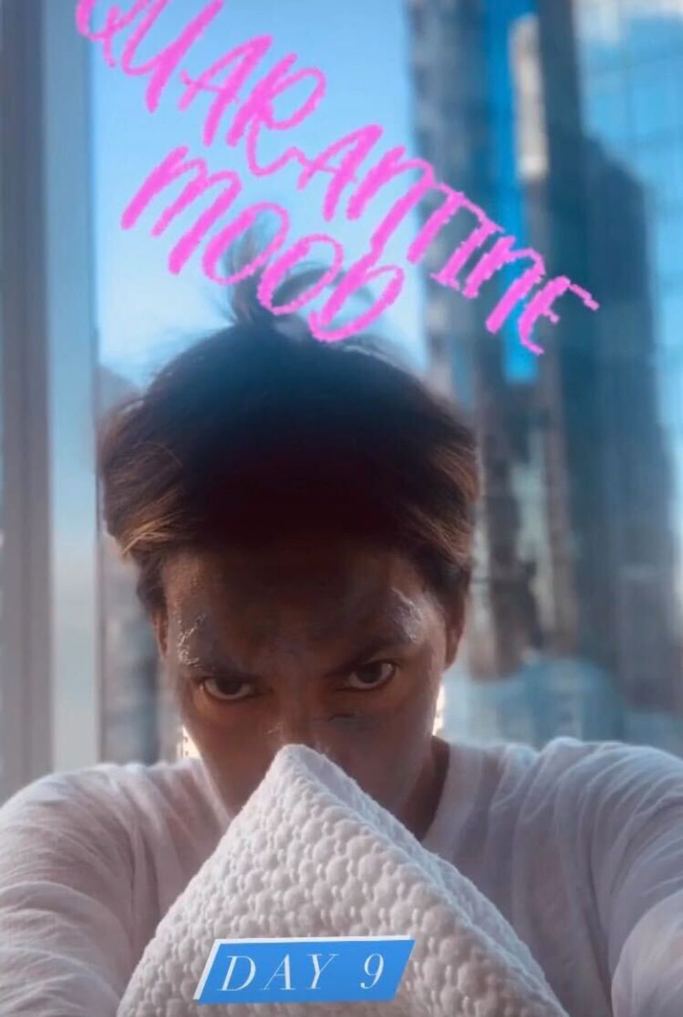The latest update, from day nine (October 19), shows her "quarantine mood" — holding a blanket and wearing a face mask.