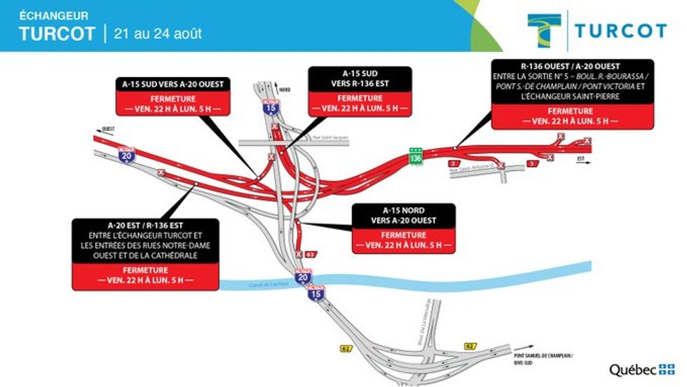 Weekend drives through the Turcot Interchange are set to be a huge headache for Montrealers. Extensive construction will completely shut down a large section of Autoroute 20 to the Ville-Marie Tunnel and Saint-Pierre Interchange. The work will happen between Friday, August 21 to Monday, August 24.