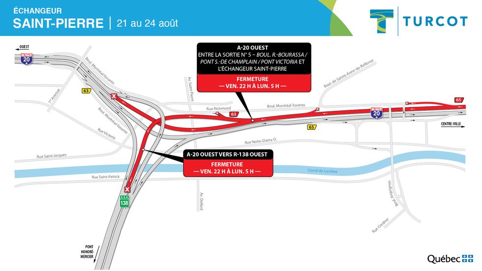 Several detours and closures will affect the western portion of the Turcot Interchange along the Autoroute 720 Ouest and Est, including Autoroute 20 Ouest and Est.
