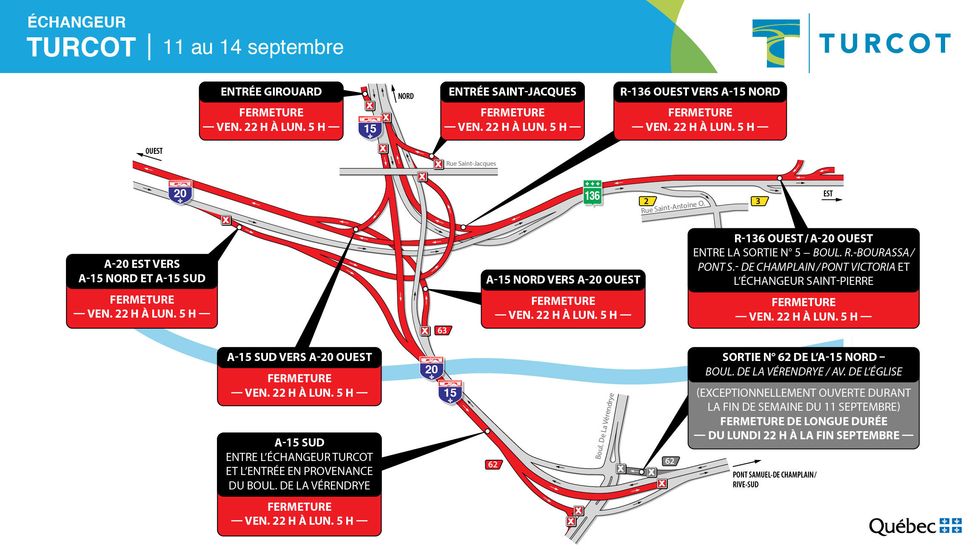 The Ministry said that "major obstacles will be put in place in the area of the Turcot and Saint-Pierre interchanges during the weekend of September 11, including Complete closure of Route 136 (A-720)/Autoroute 20 westbound between the Ville-Marie tunnel and the Saint-Pierre interchange."