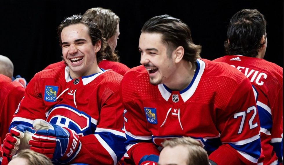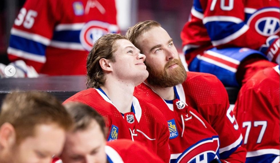 Cole Caufield and David Savard posing in a photo together during the Habs team photo session.