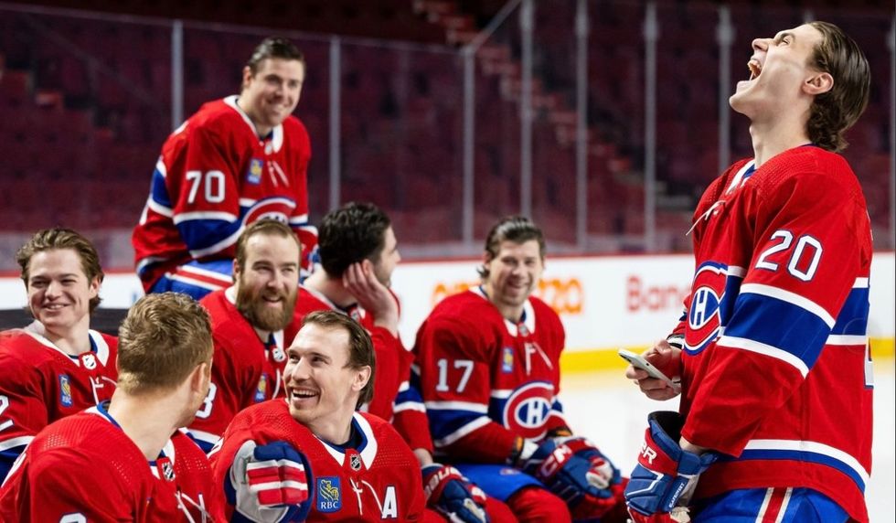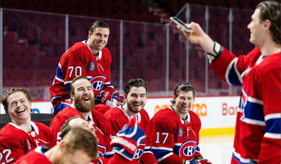 The Montreal Canadiens taking their team photo as a few players laugh.