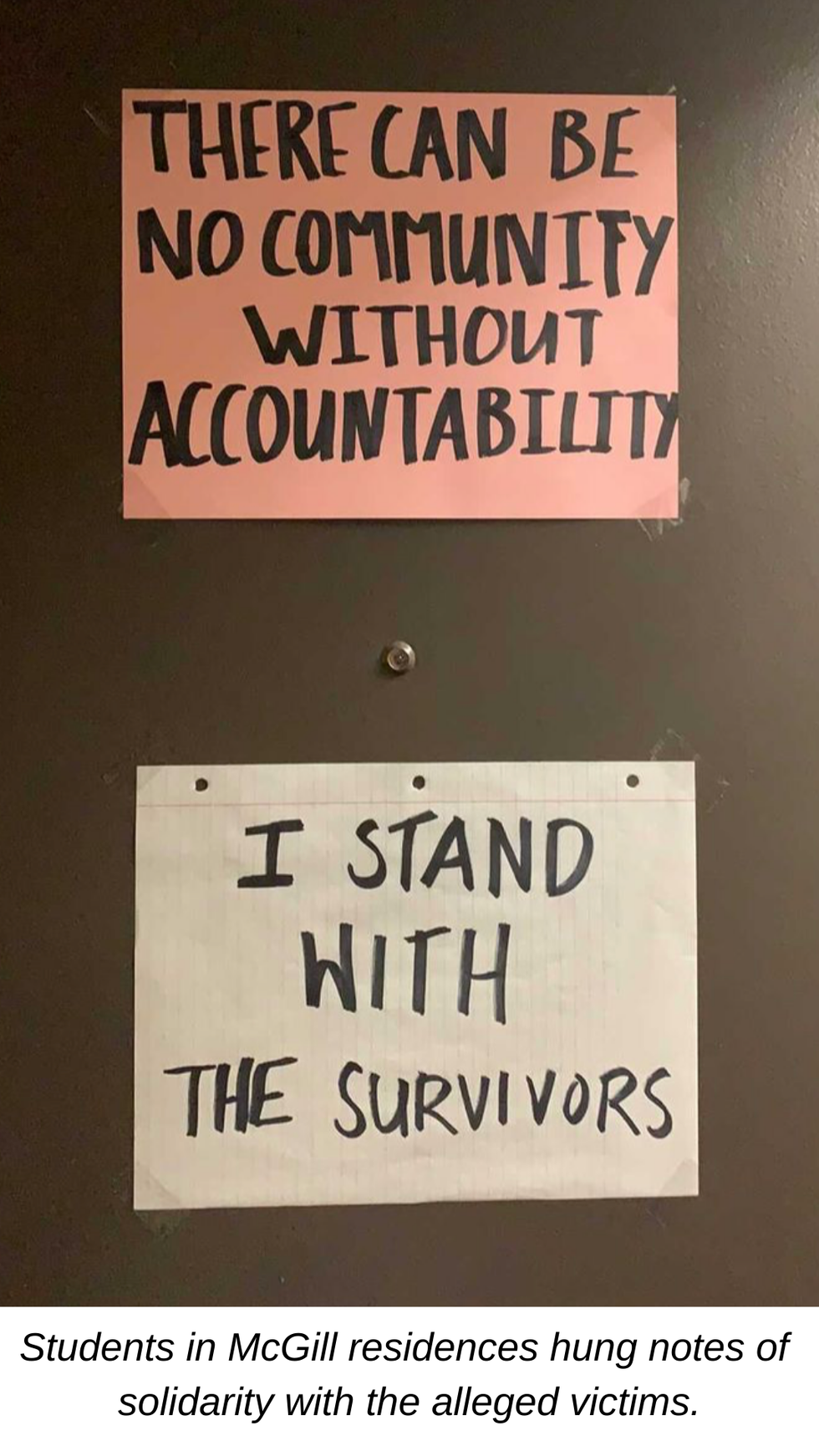 In December, five McGill University students penned a petition calling on the university to "make a statement and take action" against a fellow student, described as a first-year male, who they accused of sexual assault. The petition amassed 50,000 signatures in three days.Â