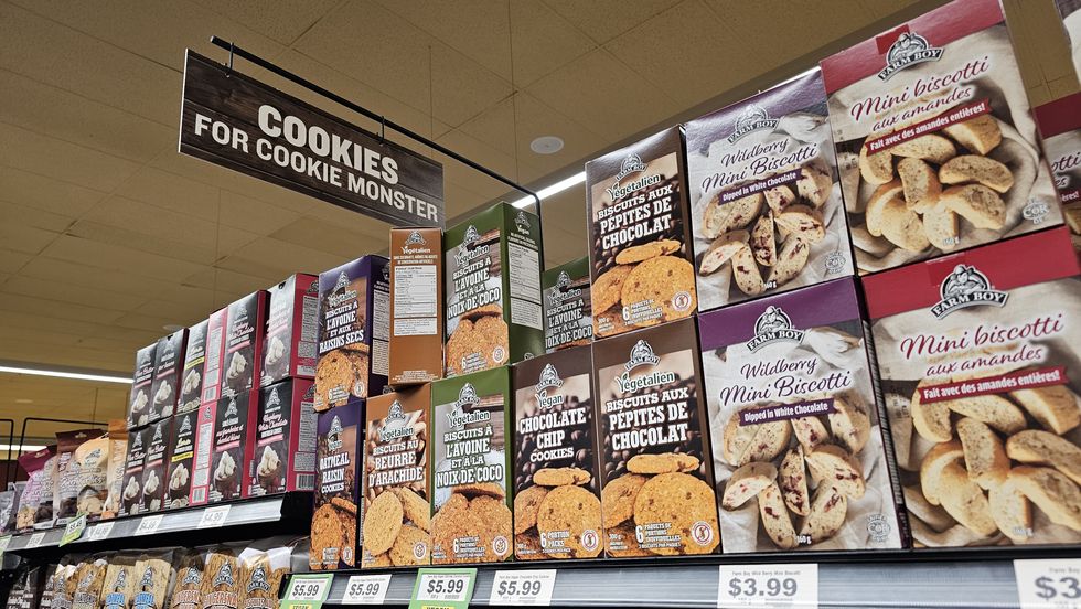 The cookie aisle at Farm Boy with $4 boxes of biscotti and $6 chocolate chip cookies.