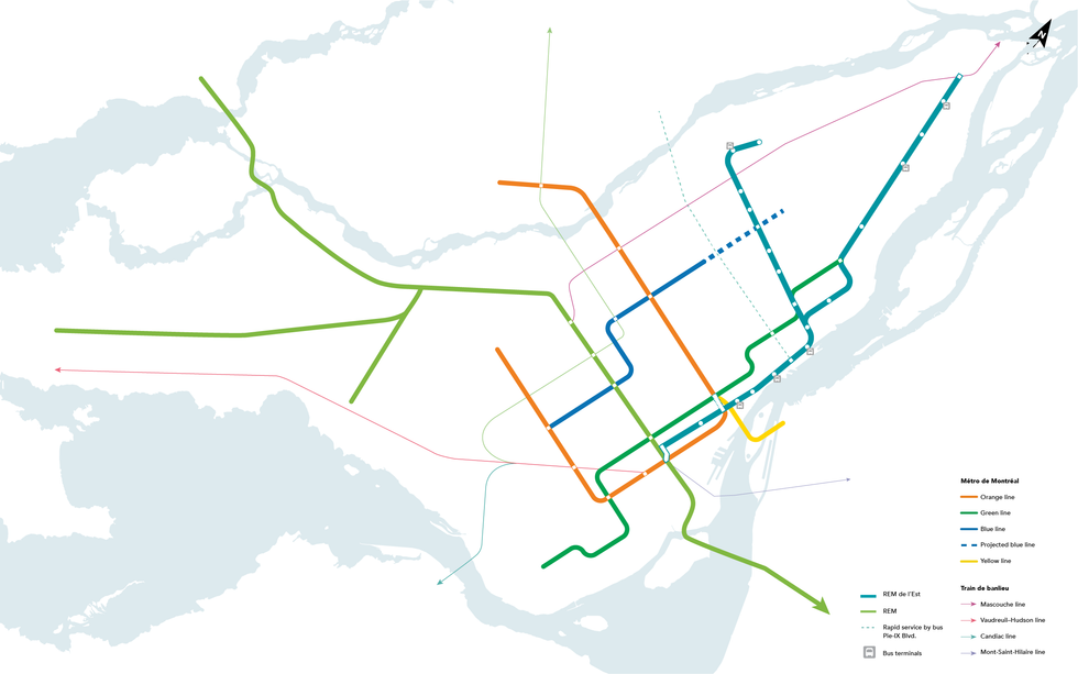 Several mega projects are currently underway that will transform Montreal's metro map. The extension of the STM blue line, and the addition of the Réseau express métropolitain and the REM de l'Est, will multiply the size of the city's rail transit network.