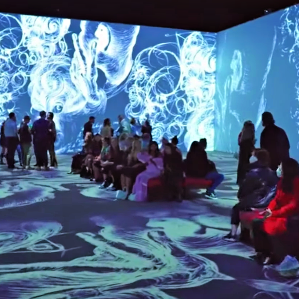 Someone on a floor cushion looking at two screens. Seating is low to the floor across the entire exhibit to create a sense of safety and sleepiness.