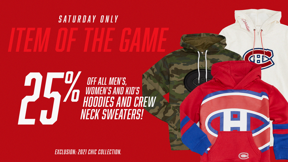 Think everything from jerseys and player T-shirts to headwear, socks and pyjamas. New items exclusive to the weekend event will be offered each week (this Saturday, April 3 you can get 25% off selected hoodies and sweaters), so be sure to check back often for official Habs gear you're going to want to make your own.