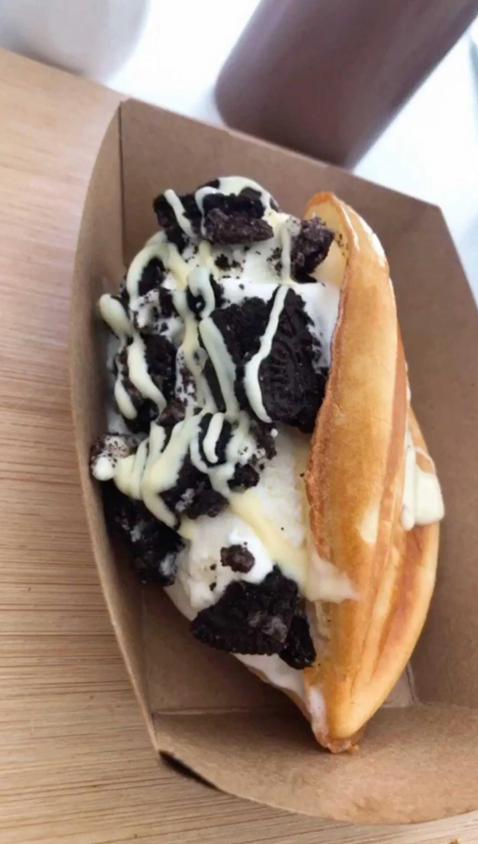 There are five types of waffle "Foufounes." One being "The Cookie & Milk" with Oreo cookies, vanilla ice cream, covered with white chocolate.