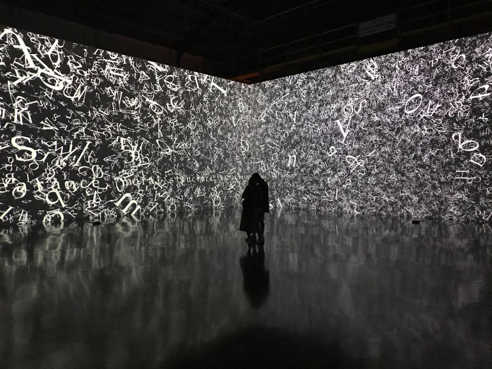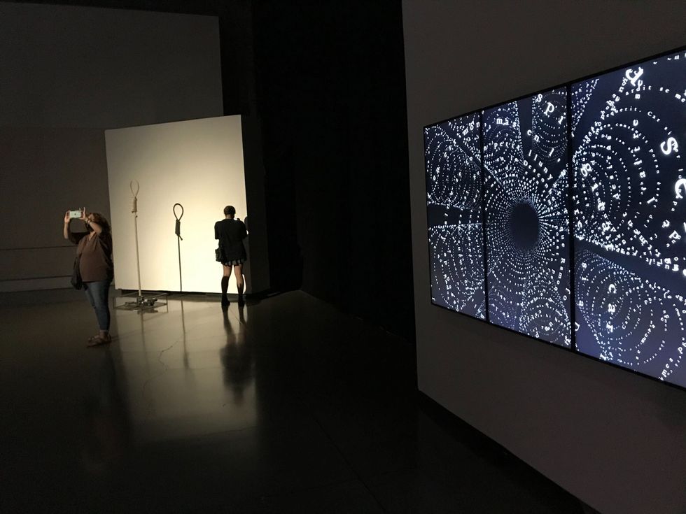 In the last room, you're greeted by two massive screens with floating letters that follow you as you move around the room.
