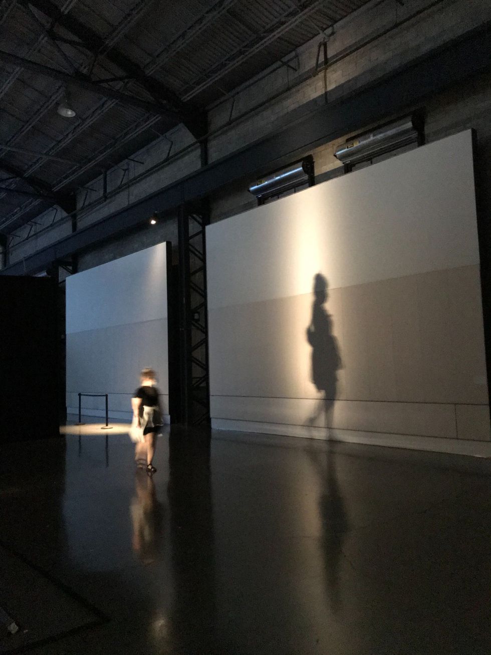 As you walk to the last room, dancing lights project your shadow as a movement tracker digitally "prints" a moving after-effect image of your shadow on a large white wall.
