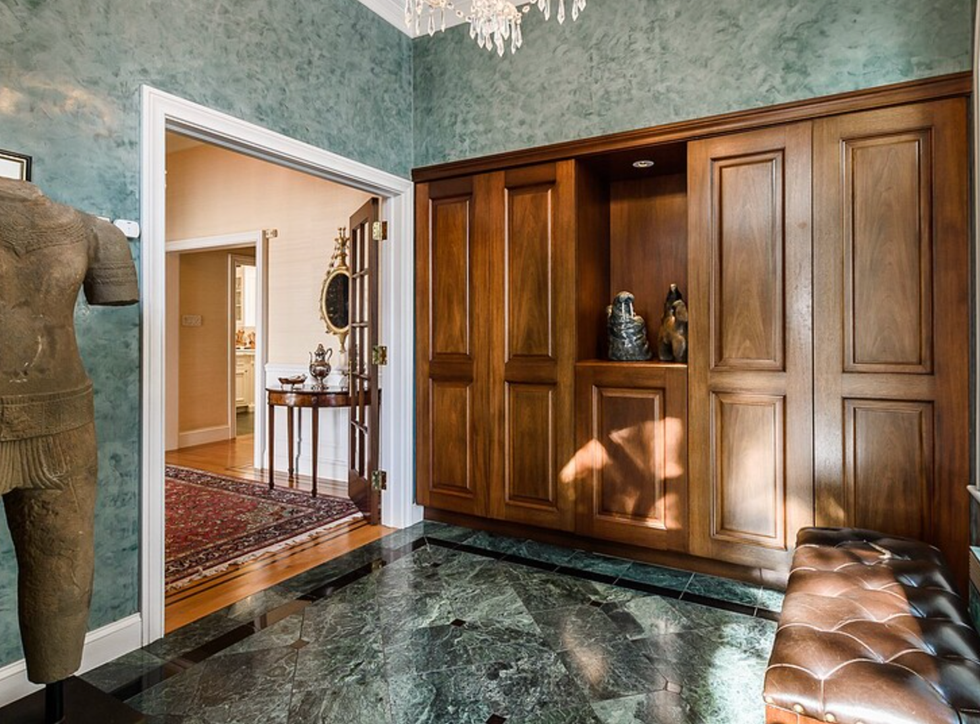The vestibule is all green marble and green wallpaper and two greenish animal statues, one of which is definitely a walrus, but the other — listen, comment down below if you can figure out what's going on there. Sea lion? Who knows. A headless, footless and handless statue stands at attention to the left of the open doorway, which leads to...