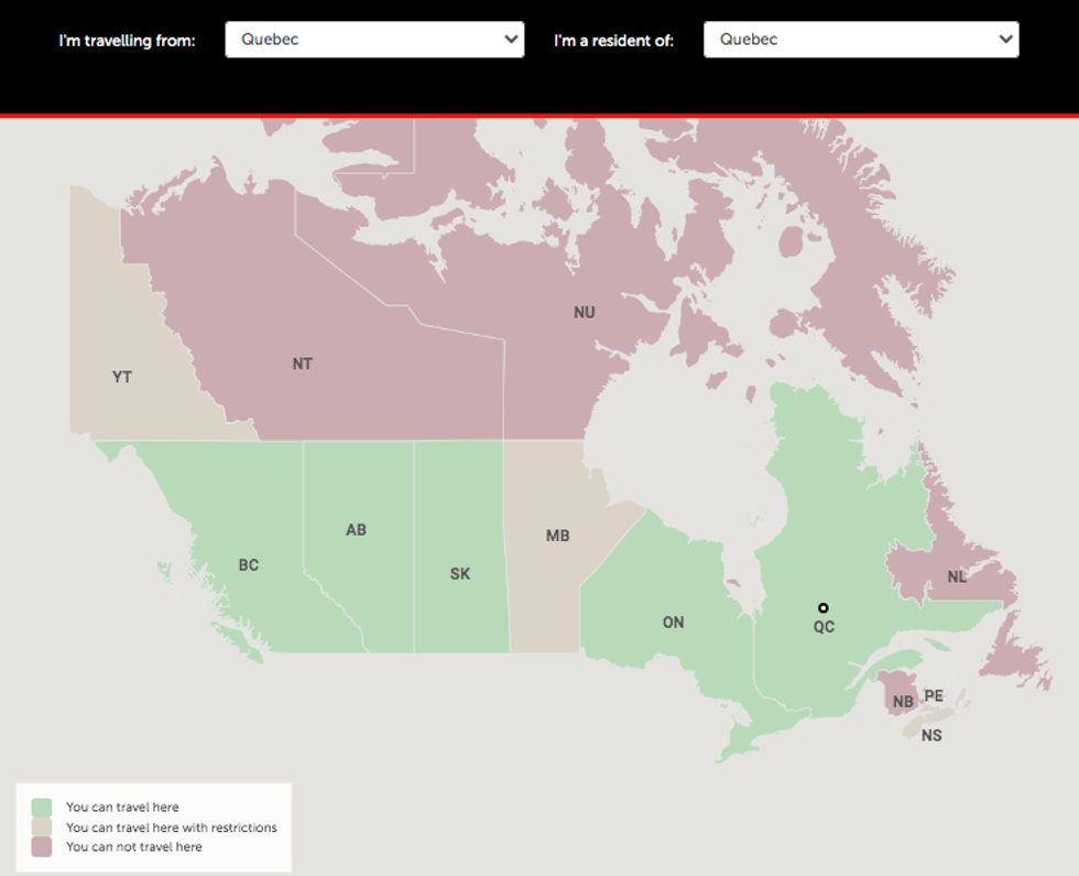 But, Quebecers are not allowed to travel to Newfoundland, New Brunswick, Prince Edward Island, Nunavut, or Northwest Territories.